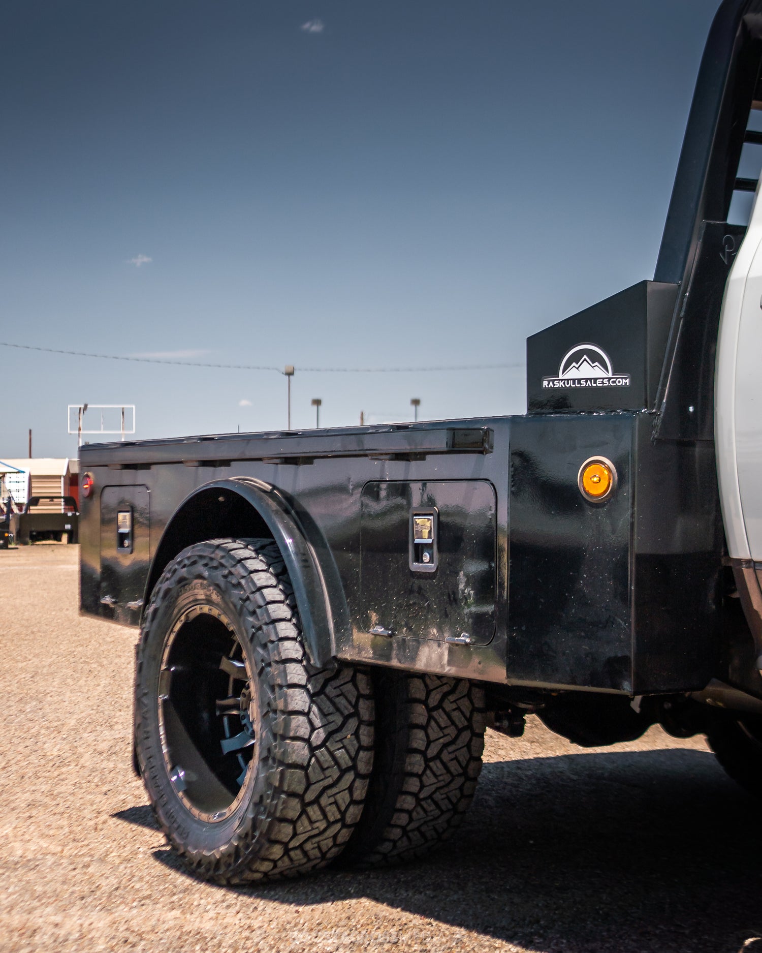 Need a working truck bed with a little extra built in storage? This skirted flat bed truck bed might be just for you. This bed has many features, some of which include four locking boxes (standard) as well as 10 gauge sides, mated with the 11 gauge full skirted bumper. 1/8” Diamond plate flooring will give you a lifetime of duty and both 7 way and 4 way towing plugs make sure you can hook up and go any time.